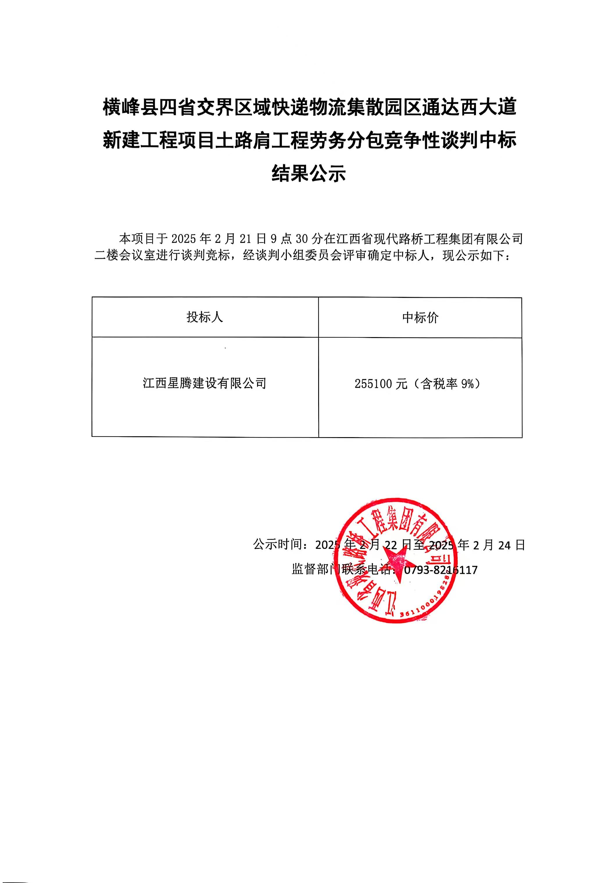 横峰县四省交界区域快递物流集散园区通达西大道新建工程项目土路肩工程劳务分包竞争性谈判中标结果公示