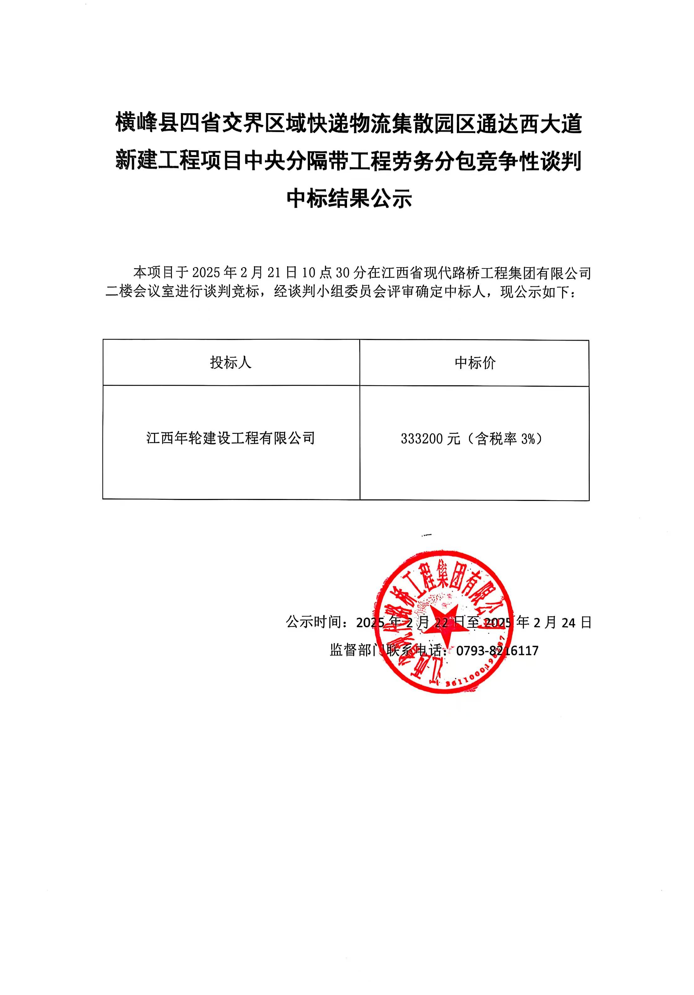 横峰县四省交界区域快递物流集散园区通达西大道新建工程项目中央分隔带工程劳务分包竞争性谈判中标结果公示