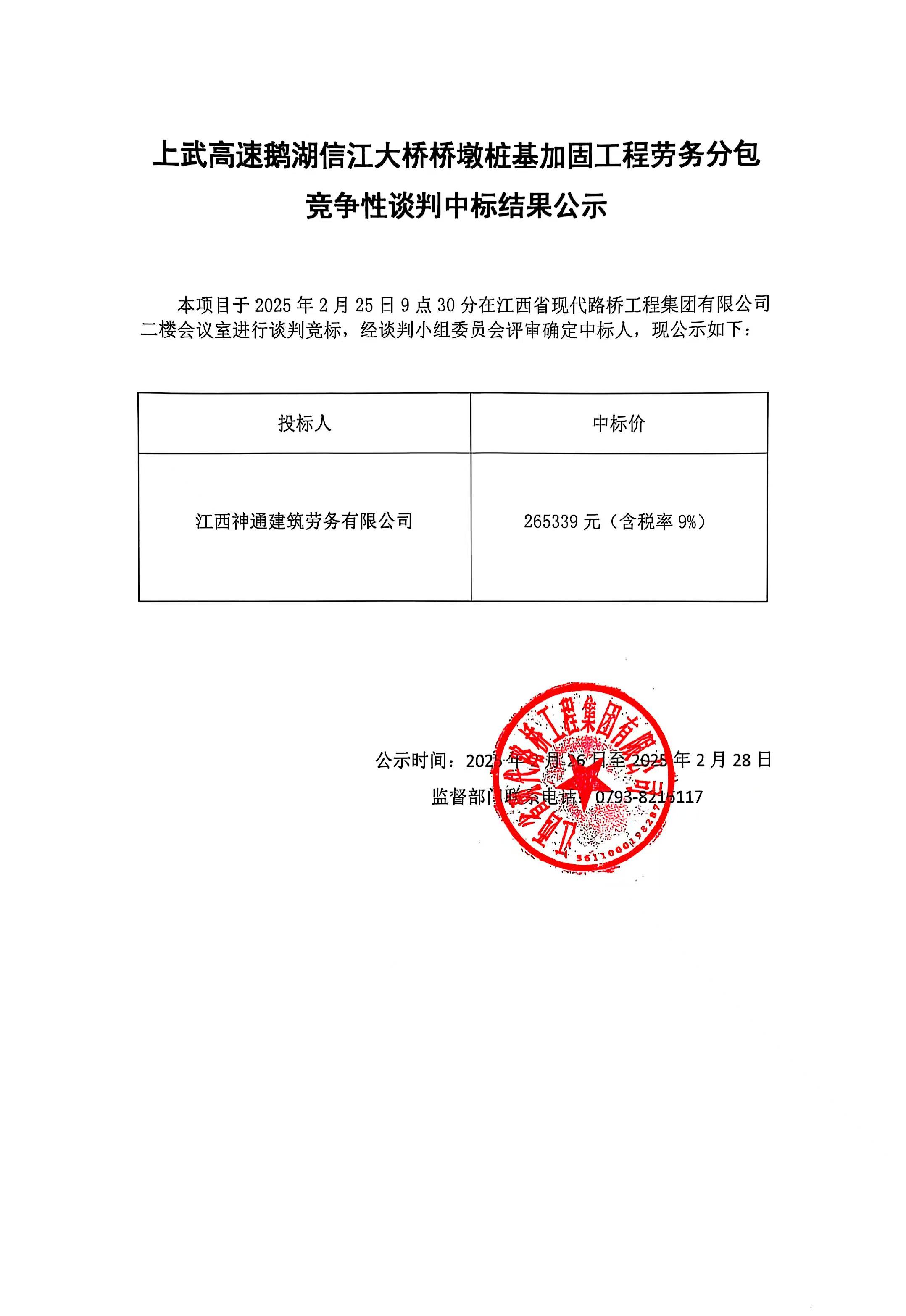 上武高速鹅湖信江大桥桥墩桩基加固工程劳务分包竞争性谈判中标结果公示